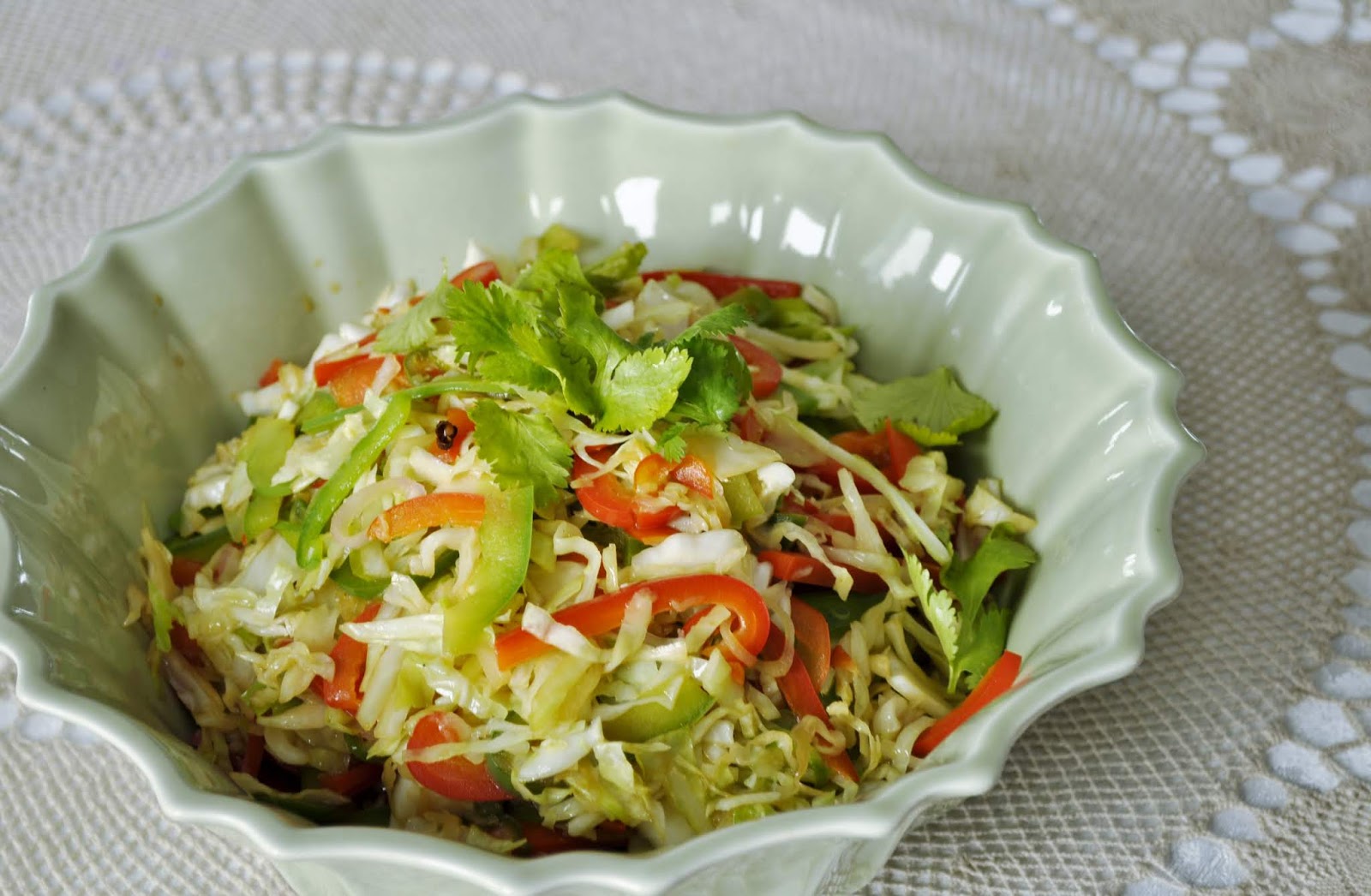 Thinly shred cabbage and green and red peppers. For sauce, in a small bowl, combine soy, vinegar, sugar and salt; set aside.